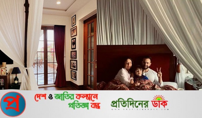 এসব ছবিতে দেখা যায়, কারিনার বিছানায় শামিয়ানা লাগানো। ঘরে রয়েছে ‘উডেন ফ্লোর’। গ্রিড প্যানেলিং করা কাঁচের বড় দরজা, সঙ্গে টাঙানো মেরুন রঙের রাজকীয় লুকের পর্দা। দরজার সামনে রয়েছে টেরেস। যার মেঝেতে রয়্যাল টাজ। দেওয়ালে শোভা পাচ্ছে, বাঁধাই করা সাইফ, কারিনা ও তৈমুরের ছবি।