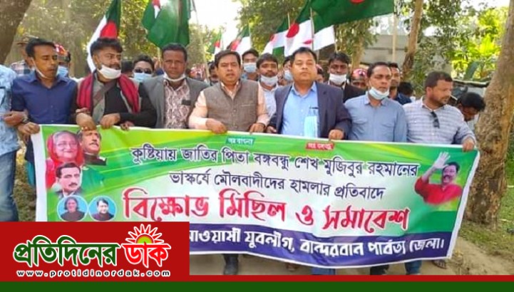 কুষ্টিয়ায় জাতির পিতা বঙ্গবন্ধু শেখ মুজিবুর রহমানের ভাস্কর্য ভাঙার প্রতিবাদ বান্দরবানে বিক্ষোভ কর্মসূচি পালন করেছে ছাত্রলীগসহ সহযোগী সংগঠনগুলো। কর্মসূচীর অংশ হিসেবে রবিবার পৃথক পৃথক ভাবে এই কর্মসূচী পালন করে জেলা যুবলীগ, ছাত্রলীগ ও শ্রমিক লীগের নেতাকর্মীরা।