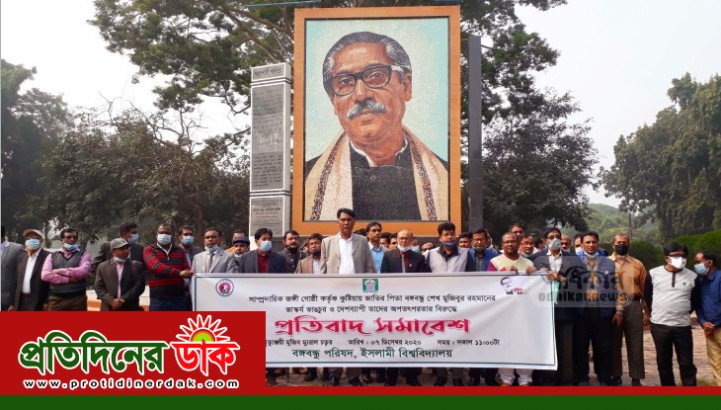 প্রতিবাদ সমাবেশে ইসলামী বিশ্ববিদ্যালয়ের বঙ্গবন্ধু পরিষদের সভাপতি অধ্যাপক ড. মাহবুবুর রহমানের সভাপতিত্বে ভিডিও কনফারেন্সে আরও বক্তব্য রাখেন কেন্দ্রীয় বঙ্গবন্ধু পরিষদের সাধারণ সম্পাদক ডা. এস এ মালেক।