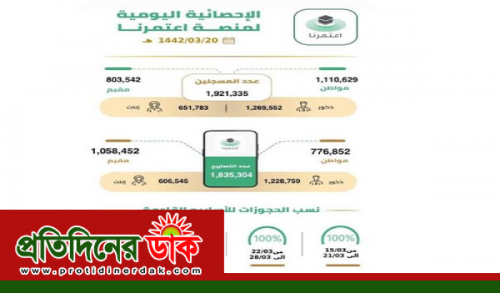 ওমরাহ ও মসজিদ আল-হারামে নামাজ পড়ার জন্য ই'তামারনা অ্যাপস চালু হওয়ার পর থেকে এ পর্যন্ত সর্বমোট রেজিষ্ট্রেশন করেছেন ১৯ লক্ষ ২১ হাজার ৩৩৫ জন। সৌদি হজ্জ এবং ওমরাহ মন্ত্রণালয়ের পরিসংখ্যান অনুযায়ী এদের মধ্যে সৌদি নাগরিক হলেন ১১ লক্ষ ১০ হাজার ৬২৯ জন। আর প্রবাসী হলেন ৮ লক্ষ ৩ হাজার ৫৪২ জন। পুরুষ ১২ লক্ষ ৬৯ হাজার ৫৫২ জন এবং মহিলা ৬ লক্ষ ৫১ হাজার ৭৮৩ জন।
